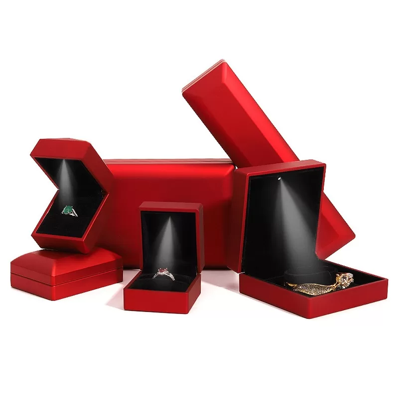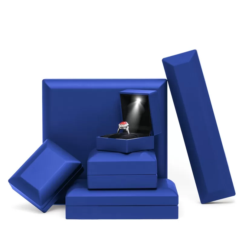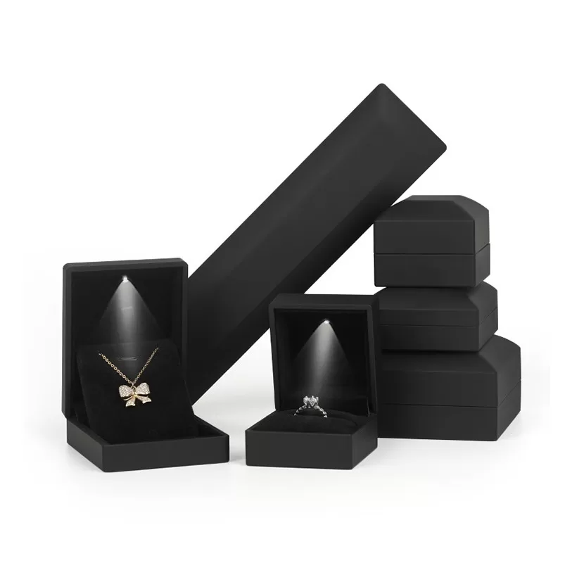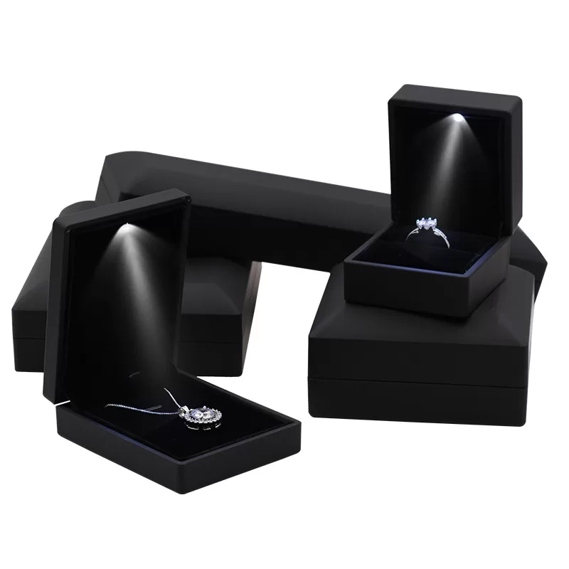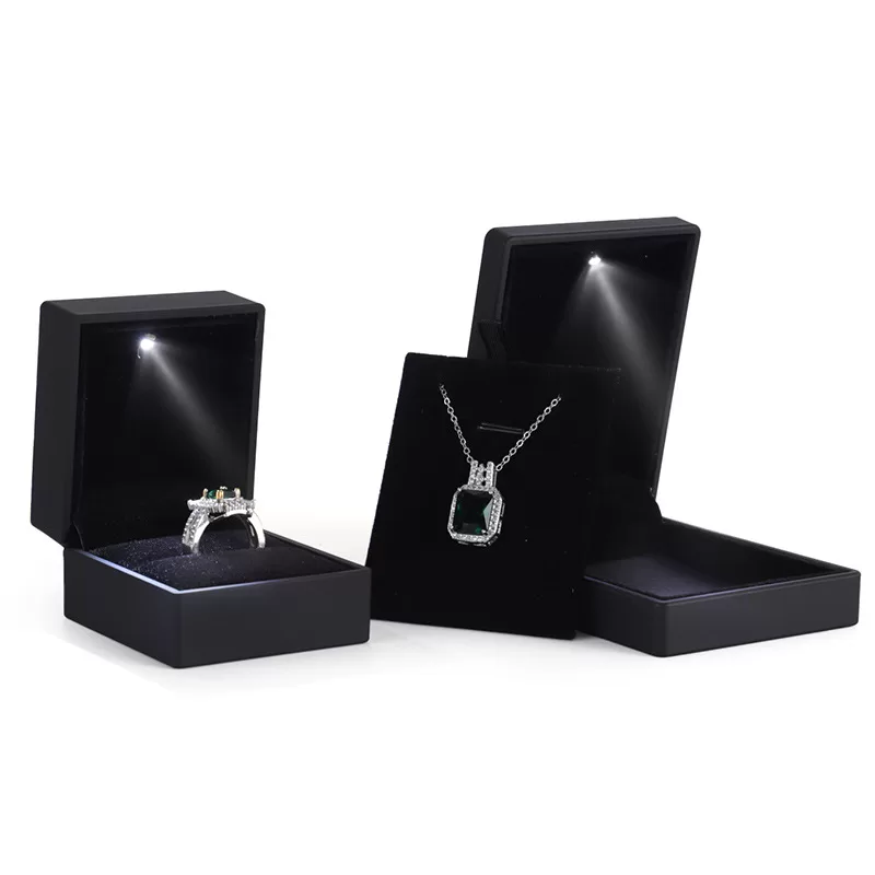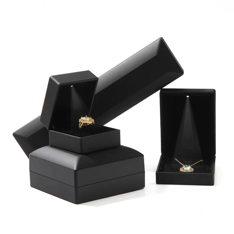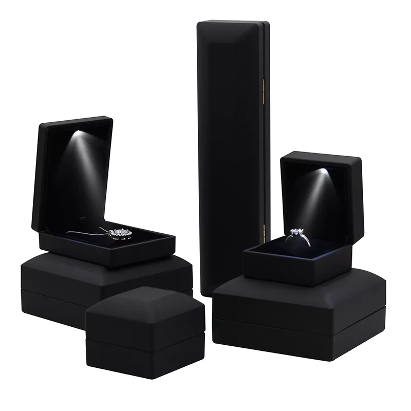 For diamonds and crystal jewelry, contrast is key. Our All-Black Illuminated Jewelry Box Series creates a dramatic, cinematic reveal. By combining a matte black rubberized exterior with a deep black velvet interior, we eliminate all visual distractions. When the built-in LED spotlight activates, the light is focused entirely on the gemstone, creating an explosion of brilliance against the dark background. This is the ultimate packaging choice for brands seeking a modern, mysterious, and high-impact presentation.