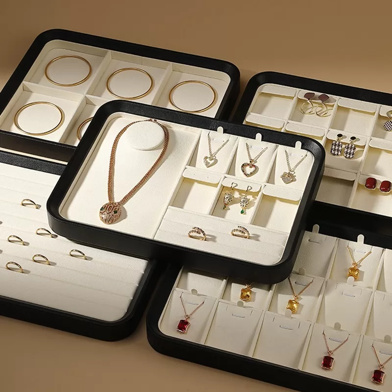 The display style must harmonize with the jewelry itself. For high-end, unique pieces, focus on a distinctive and refined presentation. Jewelry set with precious gemstones is perfectly complemented by a Luxury Black PU Leather Jewelry Presentation Tray, which highlights their brilliance and adds a touch of sophistication. For eclectic pieces, introduce varied colors and textures. Let your display design echo the descriptive keywords of your jewelry, whether casual, trendy, or formal.