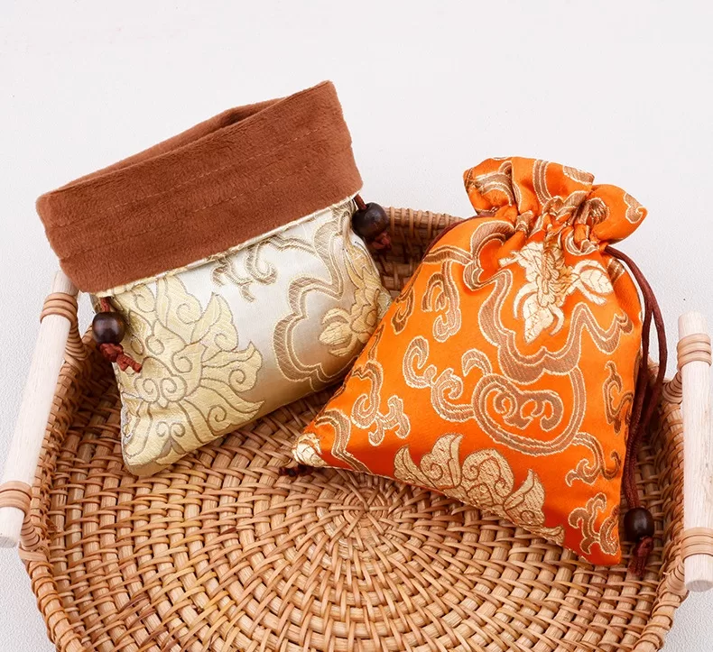 brocade double-layer drawstring pouch,jewelry pouch with flannel lining,