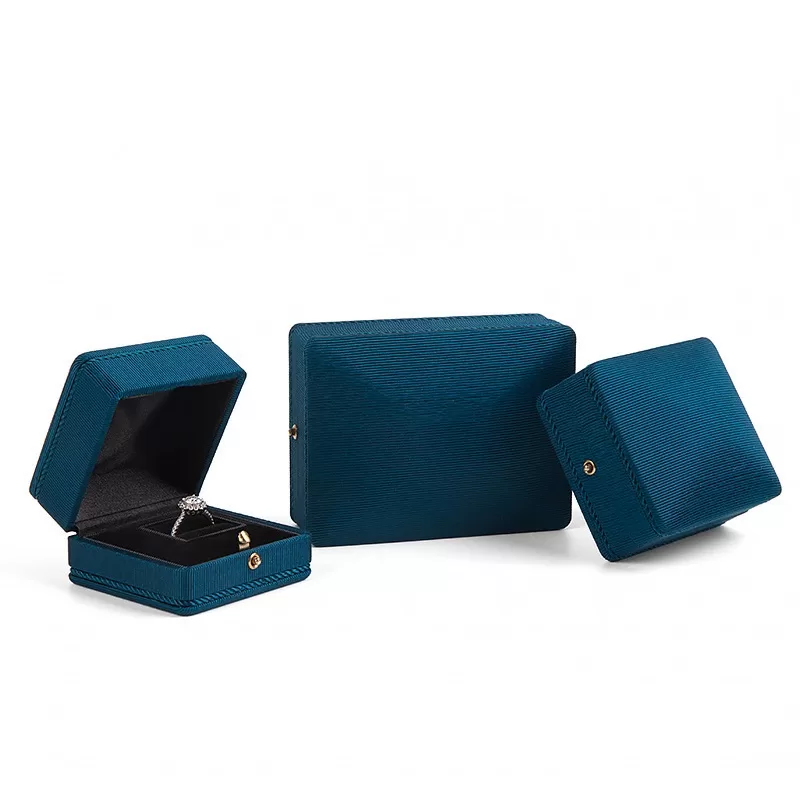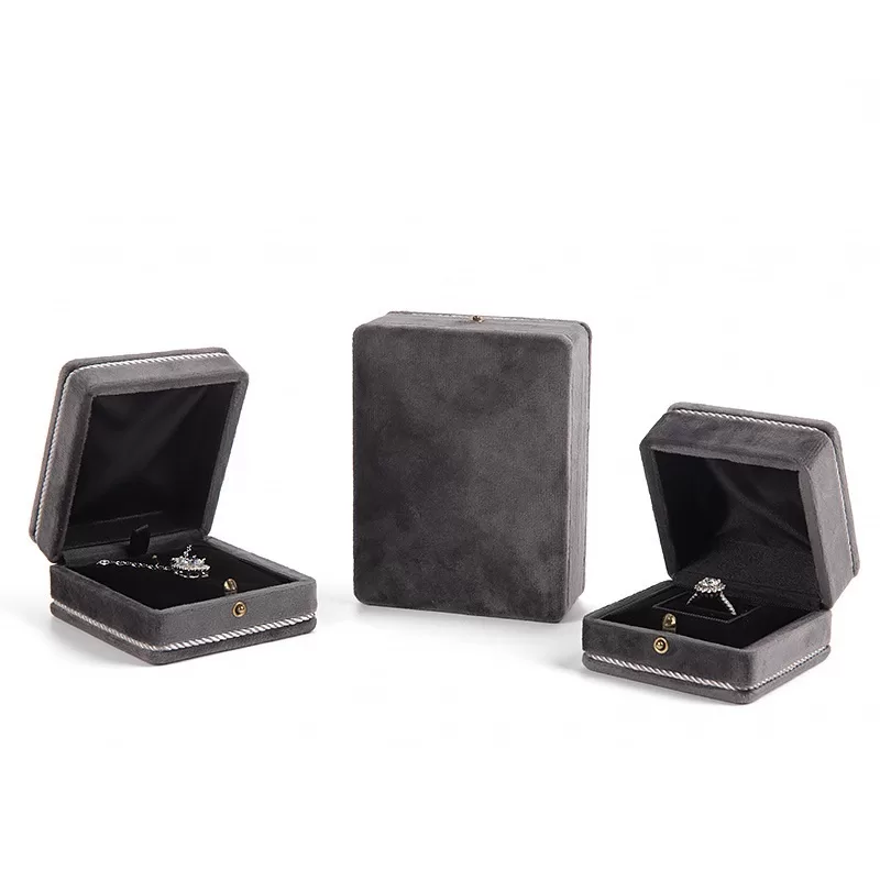 right-angle velvet snap jewelry box,velvet jewelry box with right-angle design,square velvet snap-fastened jewelry box,braided trim jewelry box