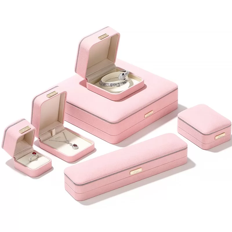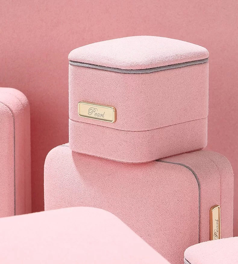Evoke romance and tenderness with the 028-D Tender Pink Series. This exquisite packaging features a pastel pink microfiber exterior that feels as soft as it looks, elegantly framed by a subtle light grey trim. The design is crowned with a signature gold metal bar, adding a layer of luxury to the sweetness. Inside, the creamy beige microfiber lining creates a warm, inviting stage for your jewelry. Ideally suited for engagement rings, bridal sets, and rose gold collections. Custom logo engraving available.